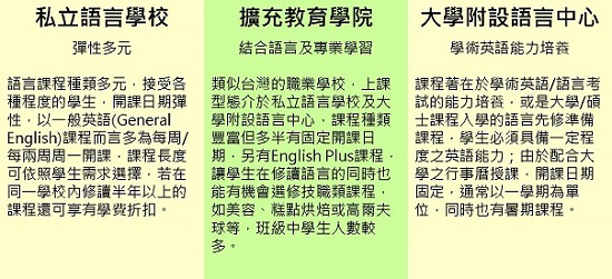 英國的語言課程選擇眾多,依照學校屬性不同,所開立課程之內容及教學方式也有所差異,主要分為語言學校、大學及擴充教育學院附設語言學校等。