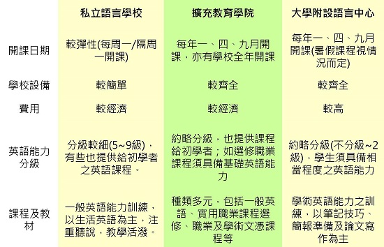 一般而言,語言學校的選擇較為豐富,開課時間也較為彈性;大學及擴充教育學院的語言中心課程,時間和程度上限制較多,例如2~3個月課程、暑期開課及語言程度要求等,但同時具有在英國校園內上課之獨特體驗。