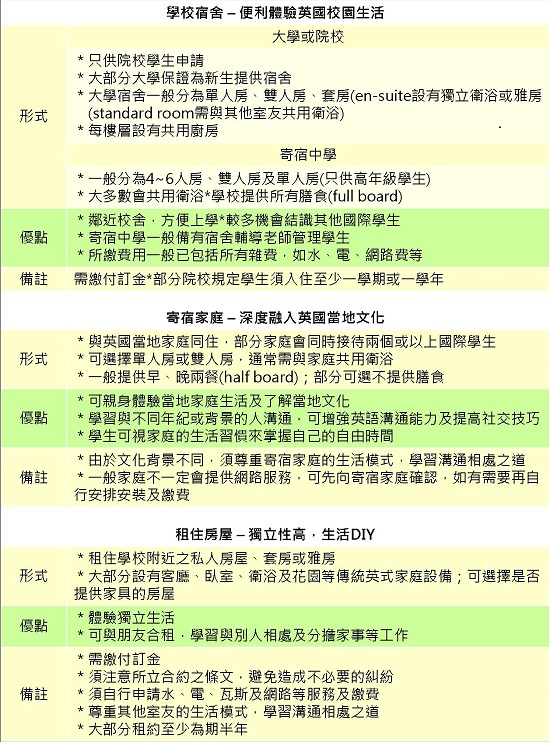 多數的語言學校都會提供在英國學習時的住宿安排;住宿種類視不同學校及地點而有所差異,選擇主要包括寄宿家庭、學校宿舍或私人租屋等。由於在一個友善的家庭環境中可以練習英語同時融入當地文化,因此寄宿家庭往往成為學生心目中住宿首選。